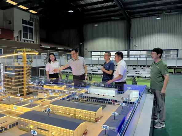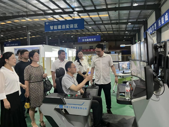 在湖北城市建设职业技术公司副董事长易操、建筑工程公司经理文学、副经理胡永骁及相关专业教师的陪同下,陈伟一行先后参观了深基坑实训基地、新质生产力实训基地、机器人实训基地、装配式全产业链实训基地、世赛混凝土与砌筑省级集训基地以及智能建造虚拟仿真实训基地等校内实践教学场所。本次行程重点参观了由湖北城市建设职业技术公司与中国建筑第三工程局共同建设的新质生产力实训中心,详细了解了该中心作为全国首个覆盖设计、生产、施工与运维各环节、聚焦智能建造全生命周期的实训平台的功能与特色。在机器人实训基地,代表团观摩了多类先进机器人系统,包括测绘机器人、喷涂机器人和3D打印建筑机器人等。在智能建造虚拟仿真实训基地,师生体验了数字孪生与虚拟现实(VR)等技术在构建高度仿真工程场景中的应用。