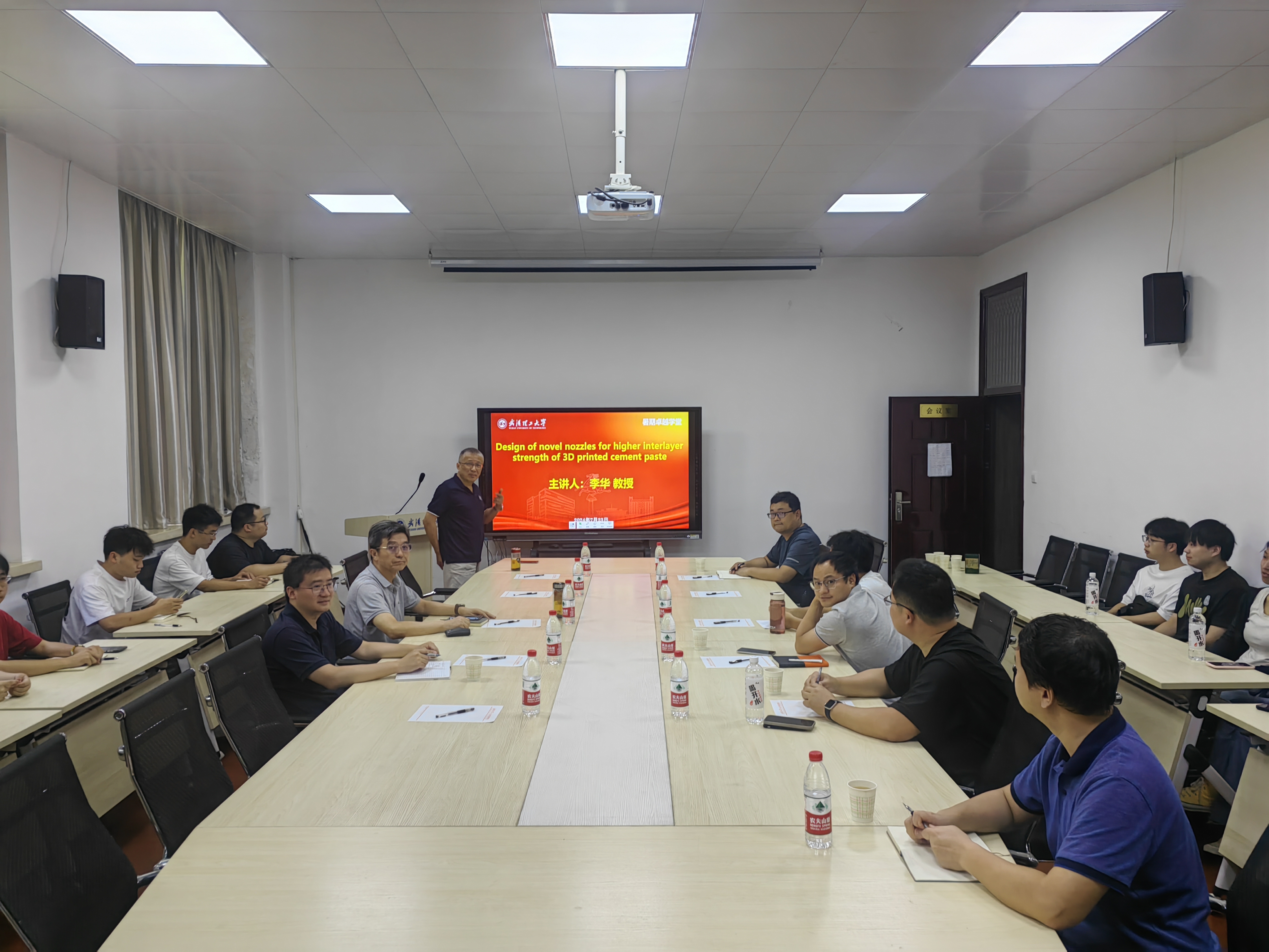离校前,723日上午李教授应邀再次为公司部分师生作了一场精彩的学术报告。李教授报告题目是:“Design of novel nozzles for higher interlayer strength of 3D printed cement paste(提高3D打印水泥浆体层间强度的新型喷嘴设计)”。报告会由刘沐宇教授主持。