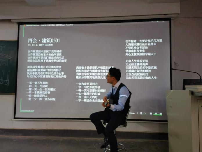 潘明丁先生是本校建筑学0501班的优秀毕业生,怀着对母校的深厚情感和法式浪漫,在讲座的首尾安插了两段现场弹唱,感怀校园时光,激起现场师生的强烈共鸣。潘明丁先生还现场耐心解答了员工提出的各种问题,现身说法地促进同学们坚定自己的专业学习方向。讲座后通过访谈和座谈与建规系教师展开了有益的交流。