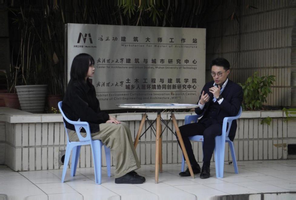 会后,在珞樱楼前,陈剑宇老师同研会宣传部记者魏思雨同学对潘明丁员工进行了专访。访谈中,潘明丁解答了关于中法历史文化街区保护的不同方法等问题。潘明丁还指出,随着人工智能等技术的兴起,建筑学未来更需关注人性,智慧城市的建设应以人文和自然为核心。