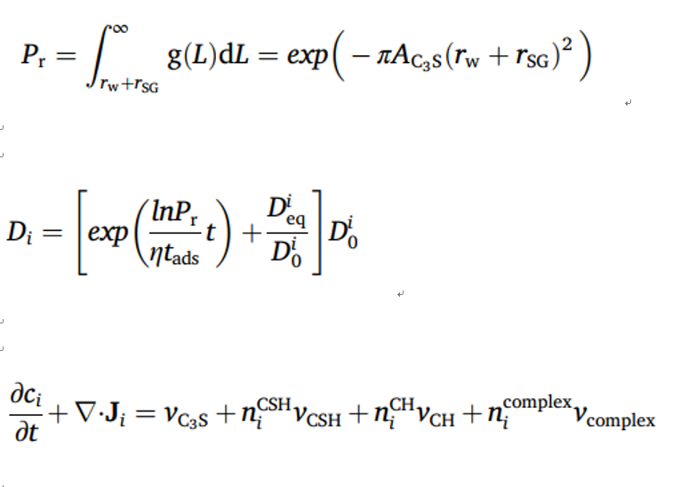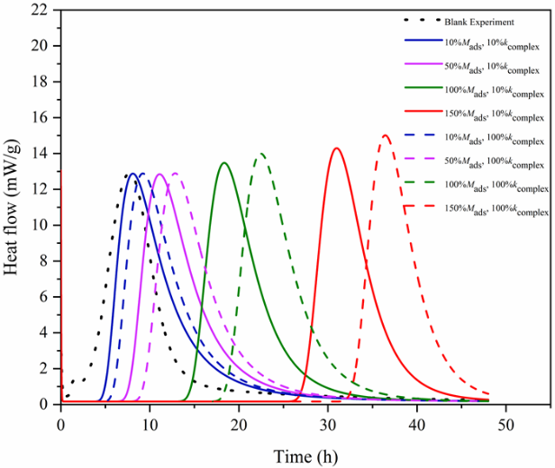外加剂对水泥水化性能影响的理论模型研究是当前国际上的研究热点,解决的关键问题是,通过理论推导,提出外加剂作用下水泥水化性能的理论模型,建立分子尺度的相互作用与水泥水化、吸附、放热等宏观性能的理论联系。刘沐宇教授团队,与新加坡南洋理工大学李华教授开展紧密的科研合作,基于PNP扩散方程,建立了吸附作用阻碍C3S水化速率的计算方法,提出了葡萄糖酸钠缓凝剂对C3S水化性能影响的理论模型,获得了葡萄糖酸钠掺量对C3S水化放热的影响规律,揭示了缓凝过程中吸附作用占主导地位的缓凝机理。该模型还具有向其他同类外加剂方向拓展的潜力。