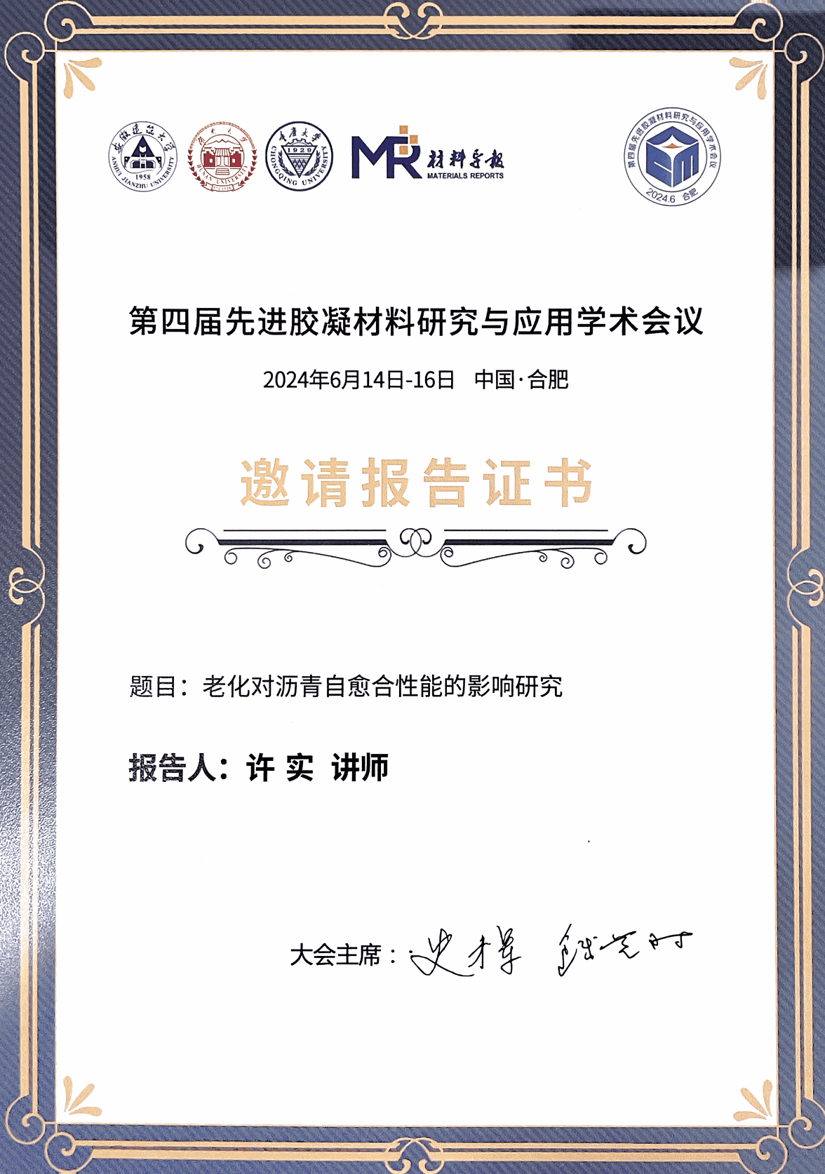 公司道桥系青年教师许实以《老化对沥青自愈合性能的影响研究》为题参加了本次大会并作邀请报告。许实博士的报告阐述了课题组在沥青自愈合性能领域的研究进展,尤其是不同老化程度、不同改性剂对沥青物理性能、流变性能、化学组成、自愈合性能的影响研究,该报告提出了沥青材料自愈合性能的综合评价与预测方法,对于提升沥青自愈合性能与沥青路面使用寿命有重要的意义,在会议上得到了专家学者的高度关注和认可。
