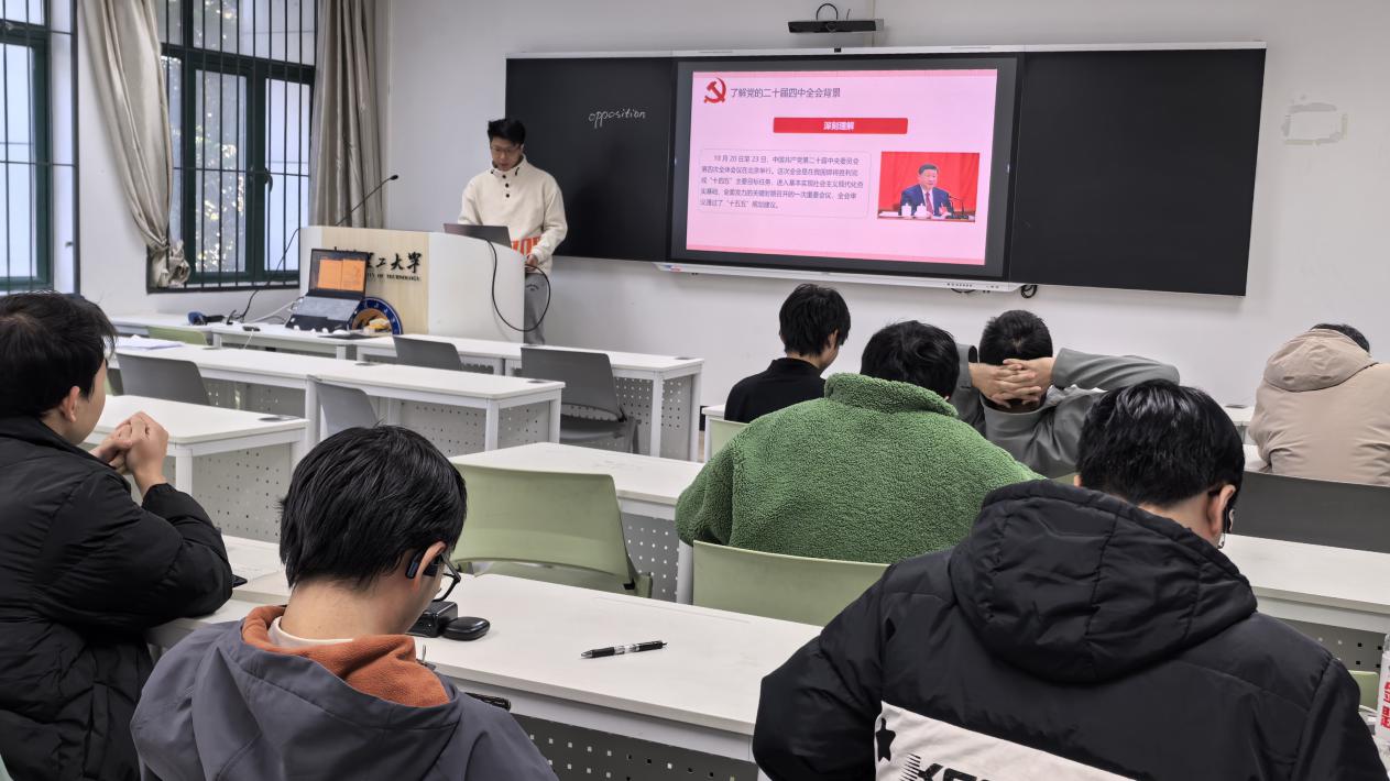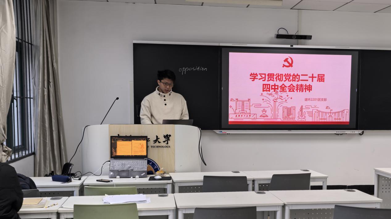 为深入领会党的二十届四中全会精神,引导团员青年准确把握国家发展大局,11月24日上午,建环2201团支部在新四106教室组织开展了“学习贯彻党的二十届四中全会精神”主题团日活动。团支书马起翔担任主讲,围绕全会背景、核心精神、重点任务与青年担当等方面进行了系统讲解。