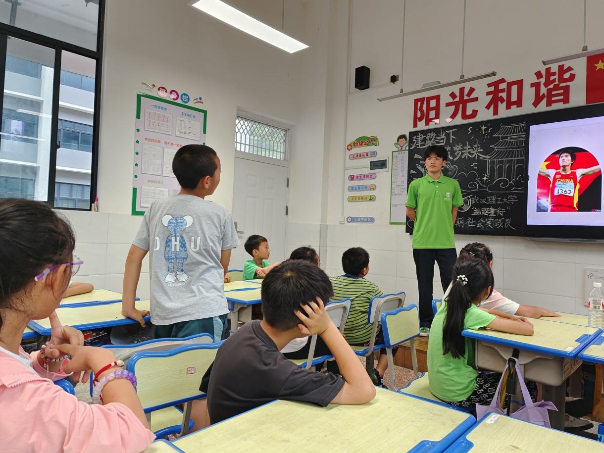 在课程的最后,实践队员们着重强调了所蕴含的体育精神。队员们通过讲述运动员刘翔的励志故事和他体育比赛中的感人瞬间,让孩子们深刻体会到坚韧不拔、勇于挑战、团结协作等体育精神的重要性。实践队员鼓励孩子们在学习和生活中也要发扬这种精神不断超越自我,实现自己的梦想。